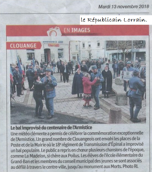 Une météo clémente a permis de célébrer la commémoration exceptionnelle de l’armistice. Un grand nombre de Clouangeois ont envahi les places de la Poste et de la Mairie où le 18e régiment de Transmission d’Epinal a improvisé un bal populaire. Le public a repris en cœur plusieurs chansons de l’époque comme La Madelon, si chère aux Poilus. Les élèves de l’école élémentaire du Grand-Ban et les membres du conseil municipal des jeunes se sont associés au défilé à travers le centre- ville, Jusqu’au monument aux morts.